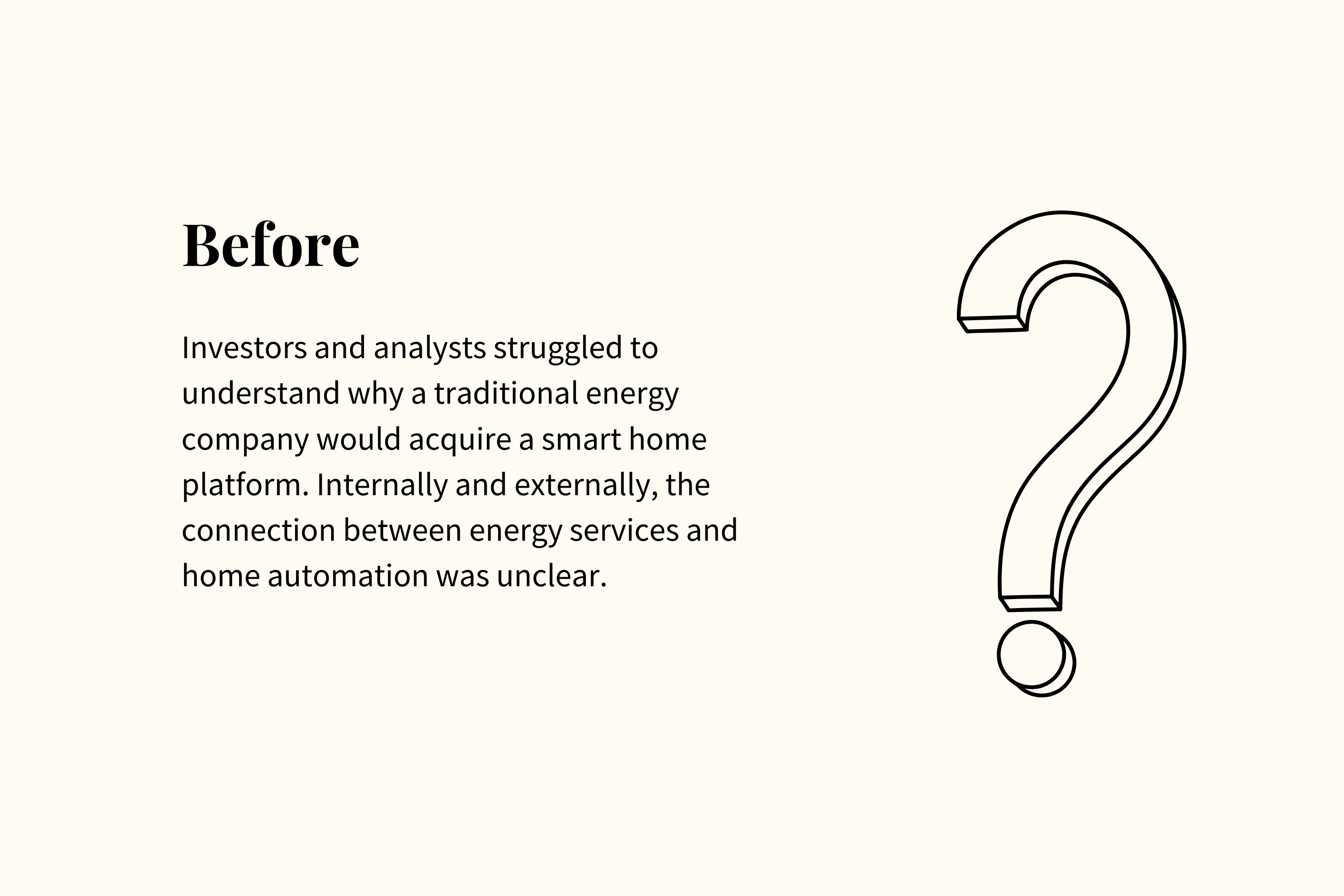 Investors, analysts, and stakeholders were skeptical about how a traditional energy company fit together with a smart home platform. The acquisition was closely scrutinized, and the strategic rationale needed to be clearly understood across multiple audiences — from customers to employees to the investment community.